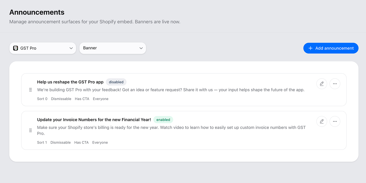 Announcement bars are app-scoped, so each one belongs to a specific app.